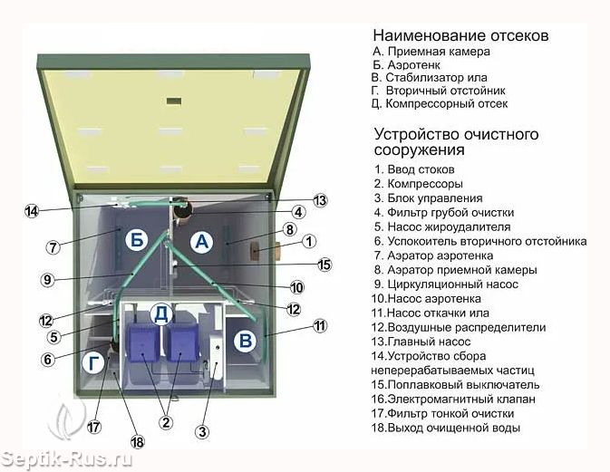 Наименование отсеков септика ТОПАС 4: