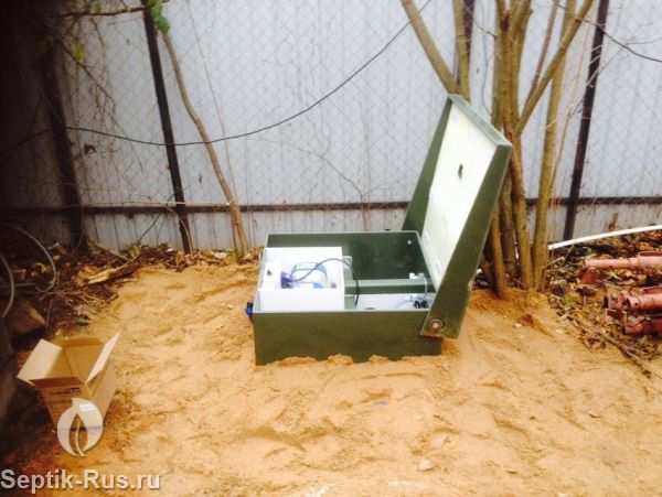 Опускание станции производится вручную либо с помощью стрелы манипулятора или крана. При обсыпке корпуса песком септик одновременно заполняется чистой водой (происходит выравнивание внешнего и внутреннего давления). Далее происходит подсоединение подводящих и отводящих коммуникаций. В последнюю очередь подключается электрический кабель, устанавливаются компрессоры и насос (если станция с принудительным выбросом).