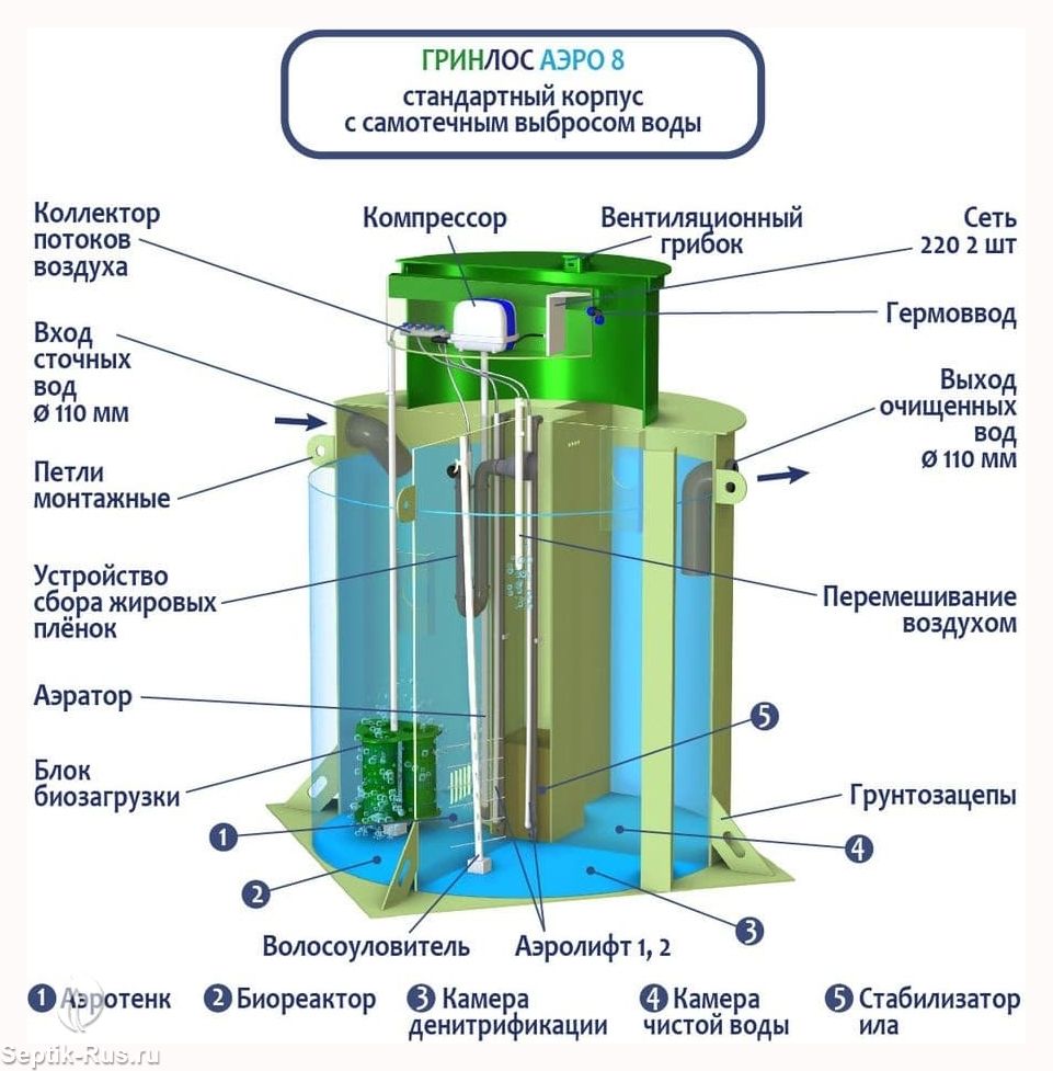 Обслуживание септиков ГРИНЛОС Аэро 8 производится один раз в год по следующему регламенту: